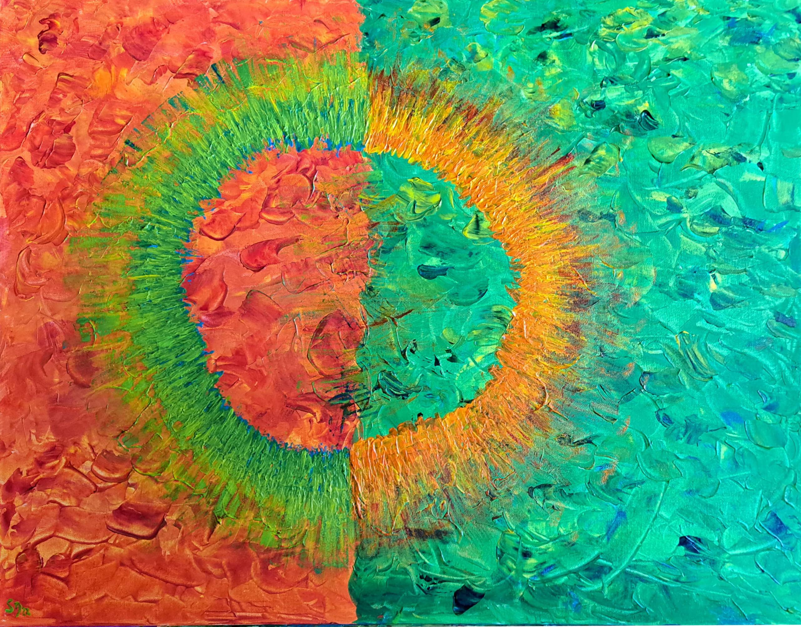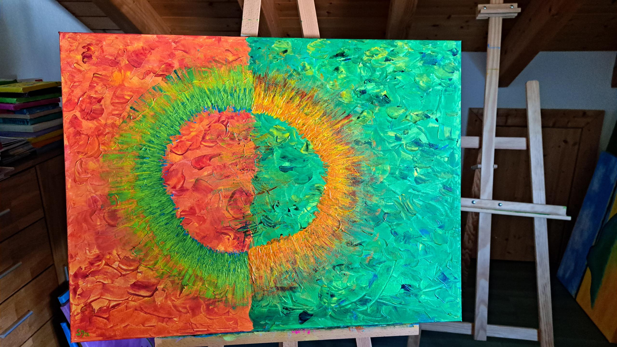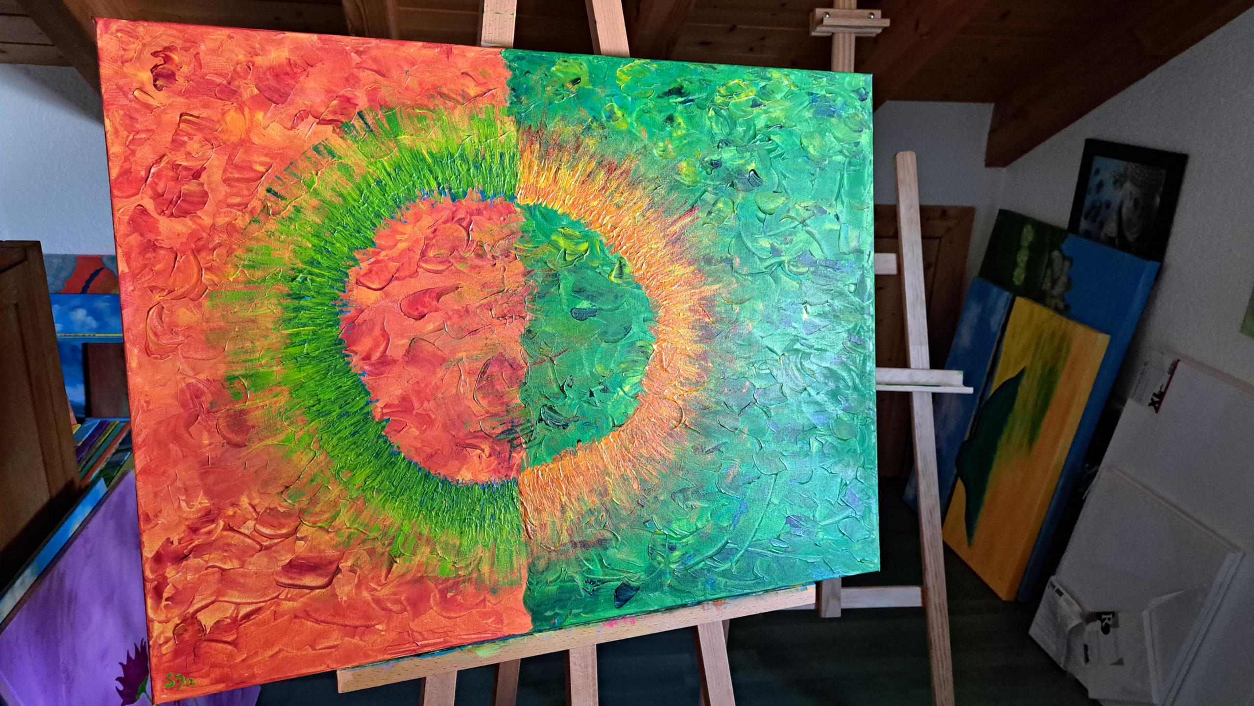 „Explosion der Farben“ ist eine kraftvolle Acrylkomposition, auf einem 60×80 cm großen und 3,5 cm starken Keilrahmen, die mit ihrer Dynamik und den tiefen Texturen die Betrachter*innen sofort in ihren Bann zieht. Die Mischung aus feurigem Rot und lebhaftem Grün in einem Wirbel von Farben steht für die Energie und Leidenschaft des Lebens. Diese Malerei passt besonders gut in moderne Wohn- oder Arbeitsräume und ist ein Statement-Piece für alle, die mit Kunst ein Zeichen setzen möchten. Als Künstlerin möchte ich die kraftvolle Schönheit und den ständigen Wandel der Natur darstellen.