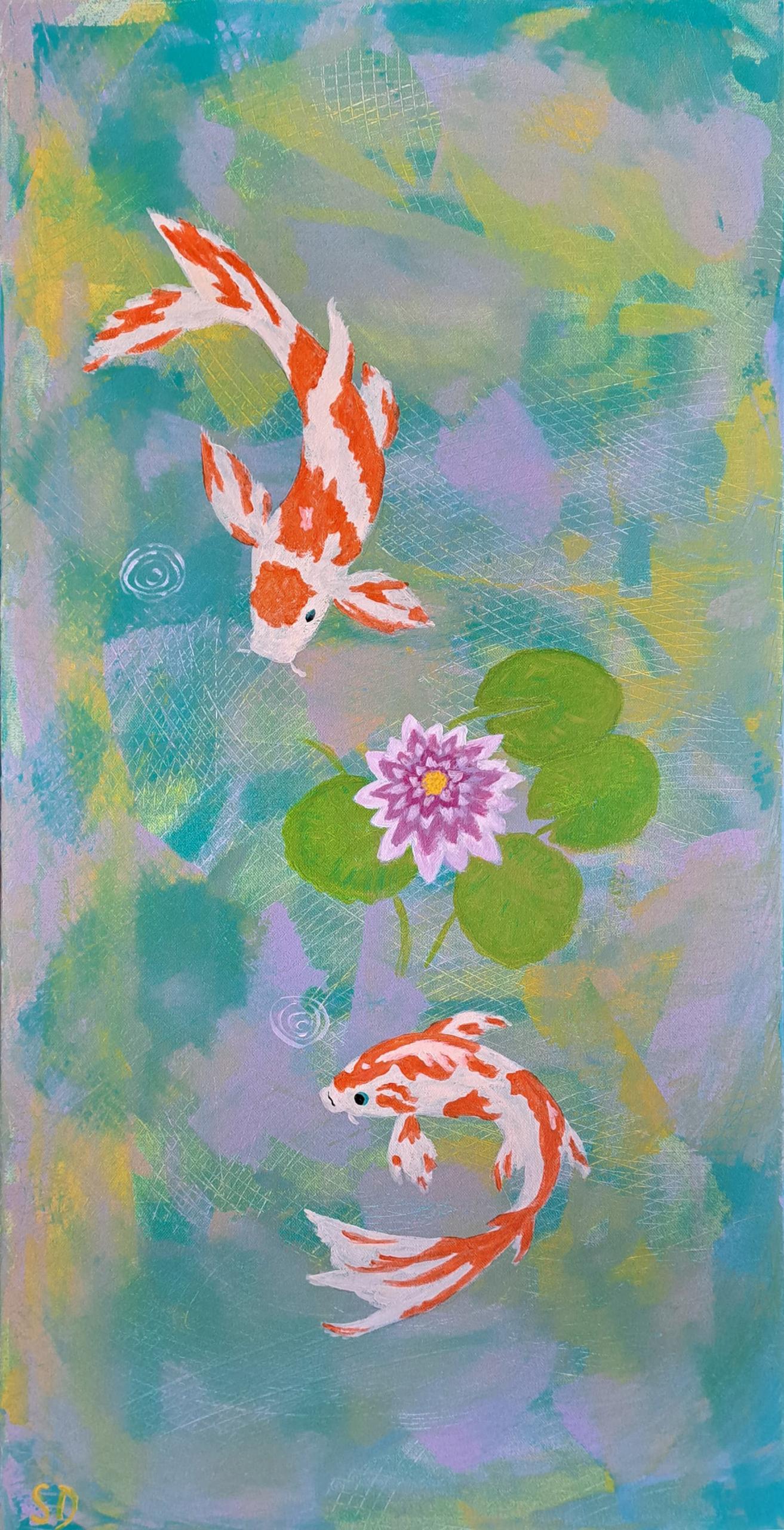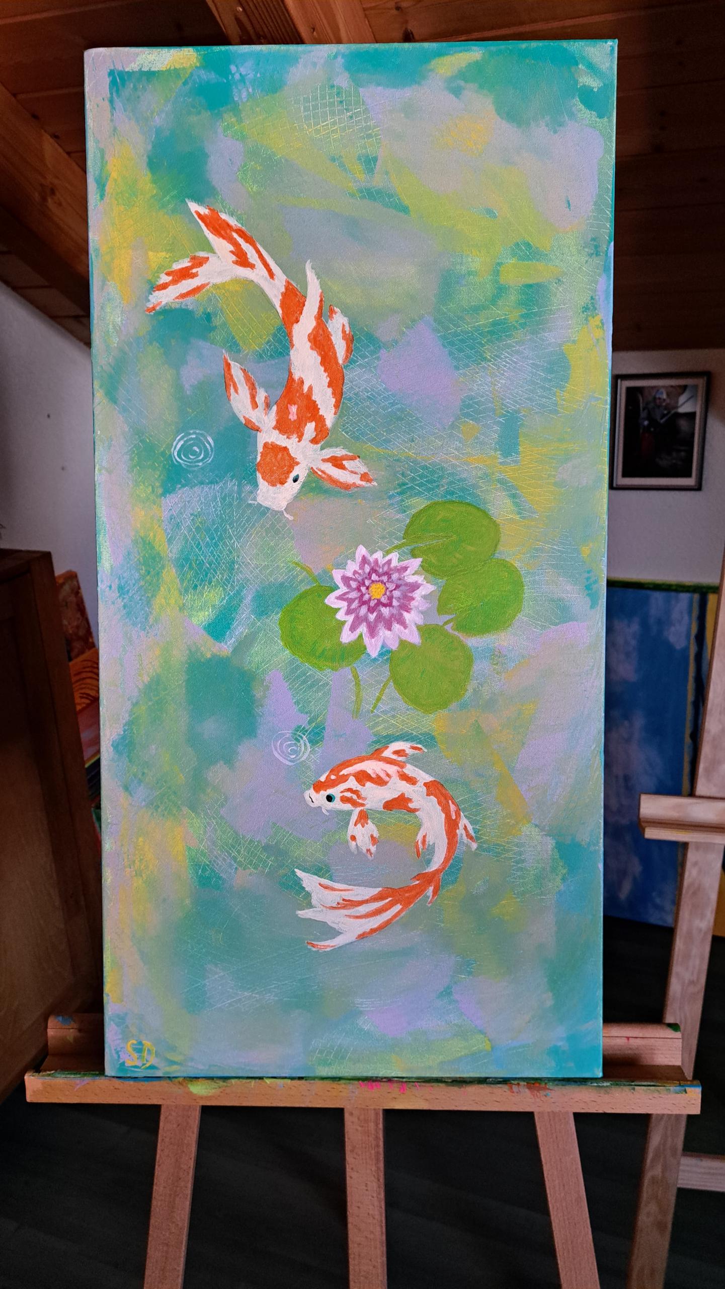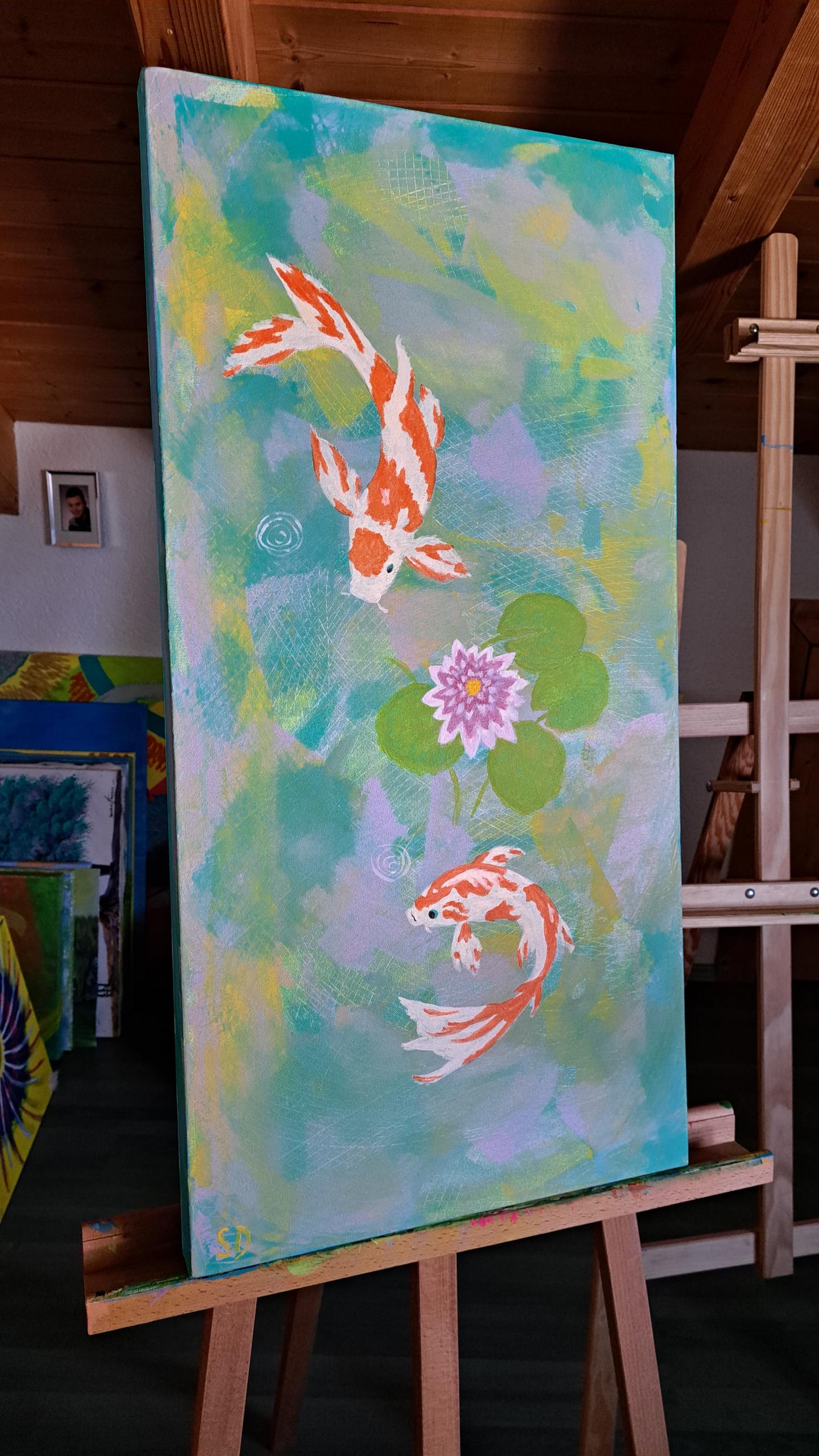 ‚Koi’s im Teich‘ zeigt in Acryl auf einem 40×80 cm Keilrahmen die ruhige Schönheit eines Koi-Teichs. Ein Kunstwerk, das Frieden ausstrahlt.